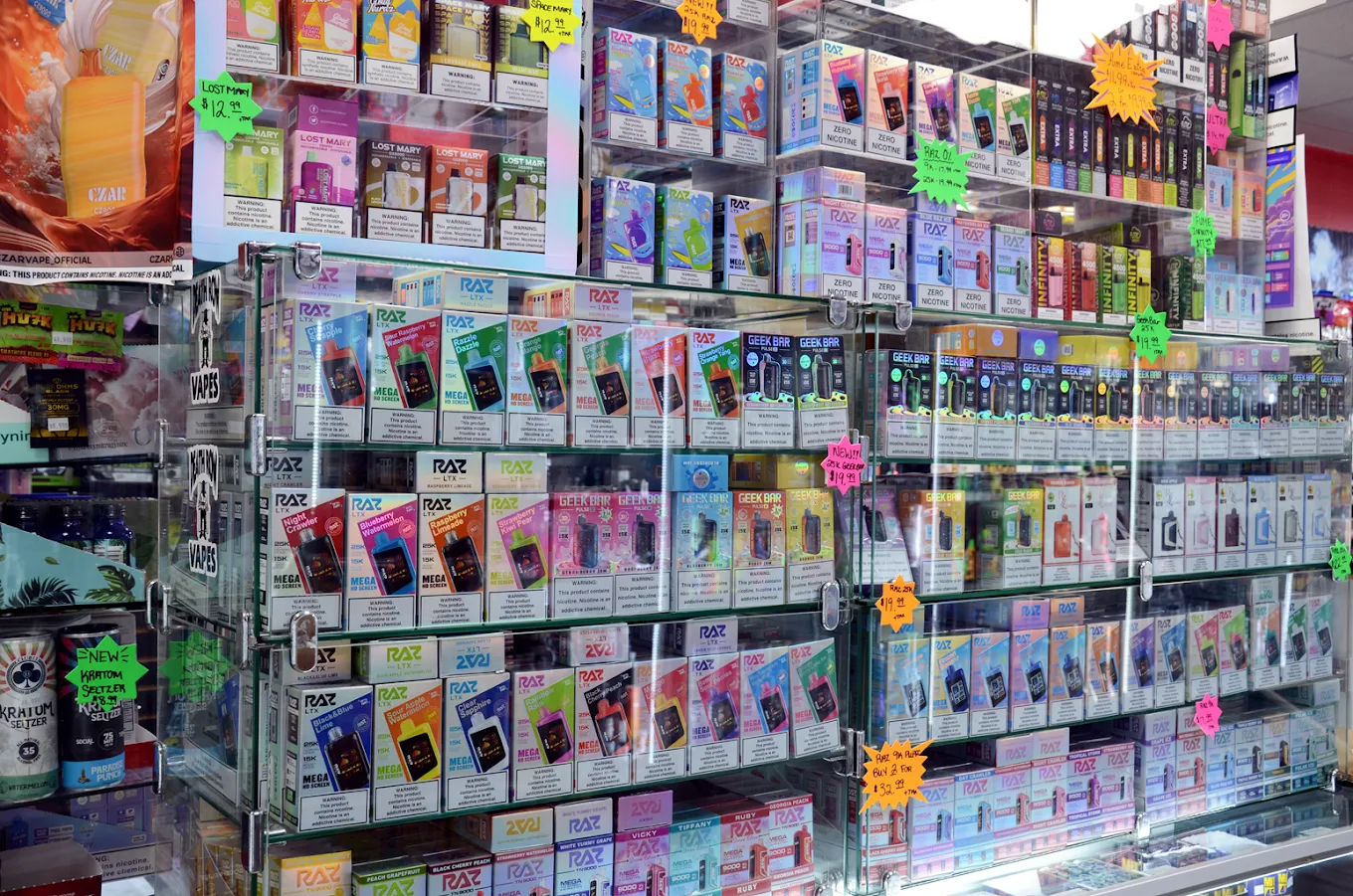 Disposable vapes from brands like Elf Bar, Funky Republic, and Lost Mary